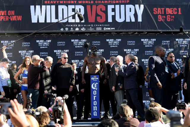 Wilder wore a black leather facemask to the weigh-in outside of Staples Center, but that was as menacing as it got as the two fighters were kept several feet apart for the traditional stare-down in the wake of an explosive final press conference on Wednesday.