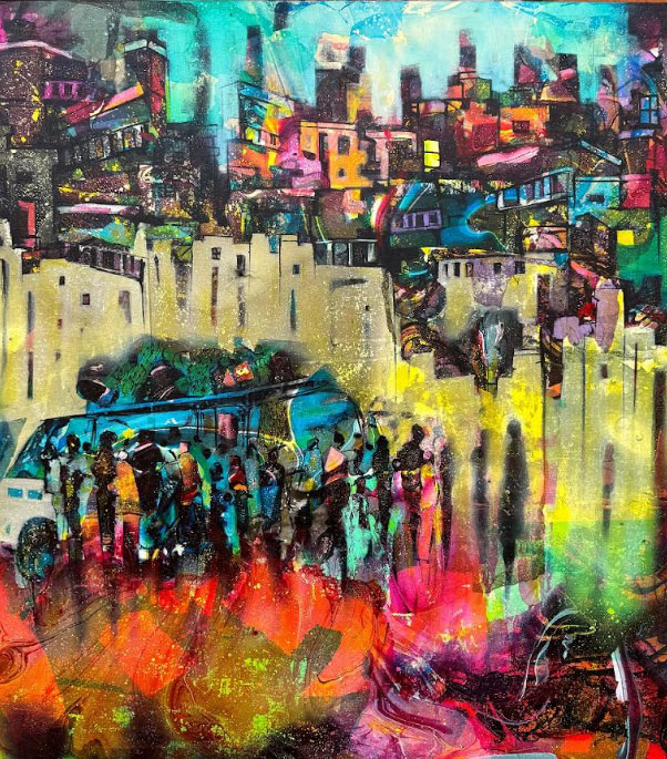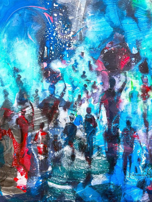 It is largely through his creative freedom that the artist is able to successfully achieve this attribute in his paintings. Kitimbo is not a formally trained artist but is self-taught with years of experimentation and innovation that lend a distinct uniqueness to his art. His technique of flowing water that critics describe as “intimate” and “expressive” was born through a series of experiments where the artist embarked on a journey of experimenting with the effect of pouring paint onto water and thereafter dipping canvas into the floating pigment to capture their intricate formation. The result was a delicate, organic movement on canvas that filled the art with warmth, spontaneity and fantasy. These qualities are visible in City Floods 2025, Village Vendors 2025 and Juice Extractors 2025 where figures appear indistinctively against a warm palette of ocean blue, yellow and green. And yet there’s an undeniable nuanced “rebellion” in how the artist applies colour on canvas that gives the paintings a chaotic character. This characteristic is evocative of his informal background in art where formality in colour application is flouted to give way to a disrupted colour scheme that breathes a new energy into the art.