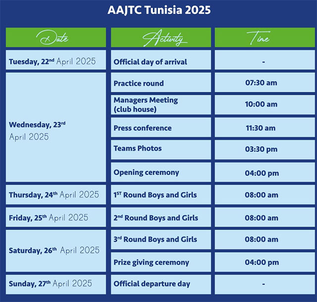 The team arrives in Tunisia on April 22 before enjoying a practice round the following day, when the opening ceremony and tournament-photo moment will be held.