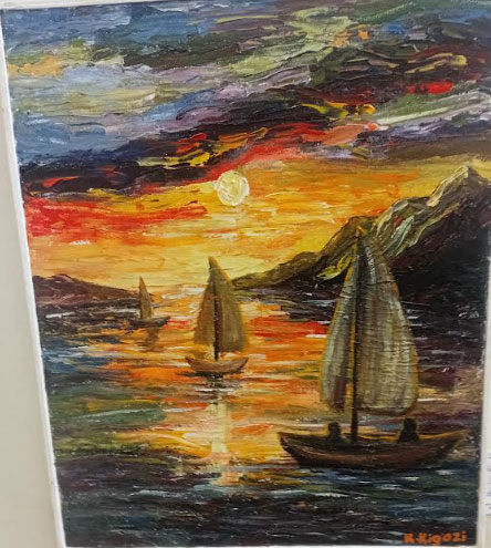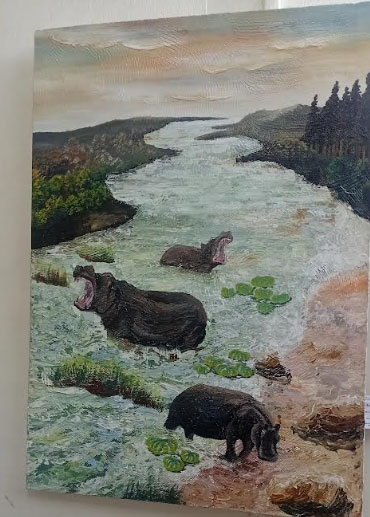 The waterscape paintings by Kigozi Kenneth reveal much more than the studio competence of the young artist. They’re also a testimony to a vivid expression of the artist’s attachment and connectedness to the subject he’s interrogating and therefore inspire a sense of deep curiosity in the artist’s work. Working with a palette knife, the artist seamlessly evokes emotional overtones in his work that the viewer is tempted to spend more time looking at it to further connect with its meaning. It is obvious that the artist possesses mastery in the skill of colour application, but also his brilliant interpretation of subject matter on canvas should be lauded. In his paintings of the fishermen’s boats sailing at sunset, the artist excellently captures this picturesque moment, and in doing so, effortlessly transports the viewer to the scene at the lake. In another painting of the three hippopotamuses swimming in water, the artist depicts more than the bully size and ferocious nature of this semi-aquatic mammal. He also celebrates the overall beauty of the natural wild depicted by the large stream of water that flows endlessly into the far distance and the lush vegetation that surrounds it.