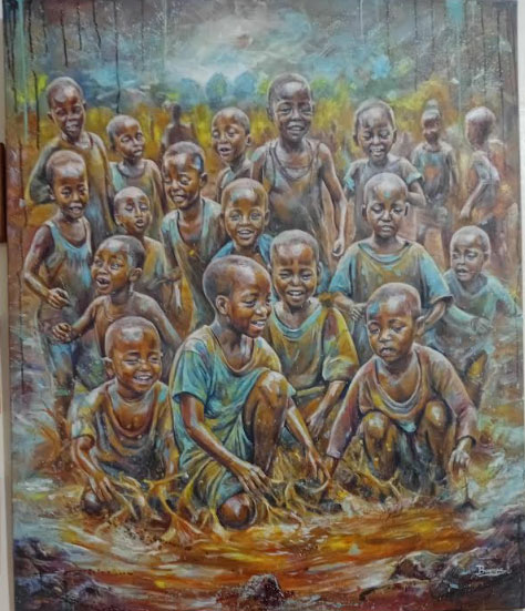 Focusing on children as a recurrent motif in his work, Bwengye Adrian draws the viewer’s attention to the subject of identity and memory, where he paints the youngsters playing different games to evoke his childhood memories and the beauty that surrounds being young and innocent. These games, like playing in the puddles of rainwater, playing traditional instruments or trying to feed the cows large clusters of bananas, are not only fun moments for the children, but the artist carries an attachment to his past that somehow shapes how he perceives life in the present. In painting the children characters and the different games they’re involved in, the artist seemingly is communicating a message of the beauty of growing up in rural communities that gives children an opportunity to freely interact with one another through playing and through the process fundamental aspects of human character are built. Unluckily, this is not the case in many urban settings where children’s interaction with their contemporaries is often restricted because of the parameters created by modernity. In light of this disparity, the artist constructs a narrative of nostalgia not only for himself but for many people who grew up in rural communities where community interaction was both promoted and celebrated through such forms of socialization.
