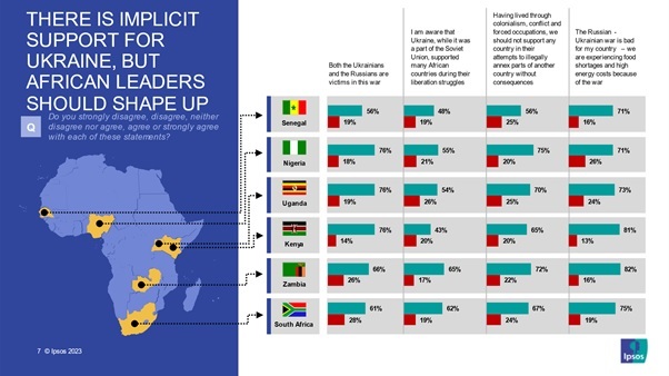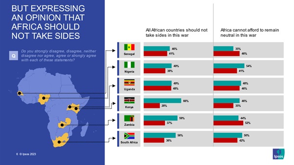 Africans expressed strong feelings that their continent should stay nonaligned or neutral in this conflict and Kenyans, especially, felt that Africa should not take sides in the war. A smaller proportion of Nigerians, however, thought quite strongly that Africa could not afford to remain neutral in the war and should support Ukraine.