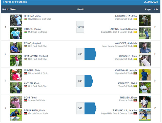 Day 1, Uganda takes the first lead with 4.5points pic.twitter.com/ObyCMjpT2g— Kenya Golf Union (@KenyaGolfUnion) March 20, 2025