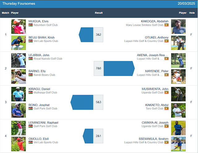 The foundation for the lead can be said to have been laid by teenage prodigies, Joseph Reagan Akena (19) and Peter Mayende (15) who stunned Kenyan captain John Lejirma and Elly Barno 7-6 in their Foursomes contest. It was Uganda’s only point of the morning’s foursomes.