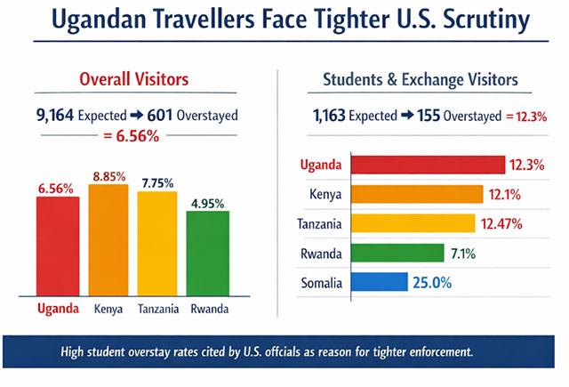 Somalia’s student figures were particularly stark, with 10 of 40 expected departures turning into overstays, a rate of 25%. South Sudan recorded 24 overstays out of 92 expected student departures, while Tanzania had 131 students remain from 938 expected departures, equivalent to 12.47%. These numbers, U.S. officials say, help explain why Uganda and several of its regional neighbours have been placed under tighter scrutiny.