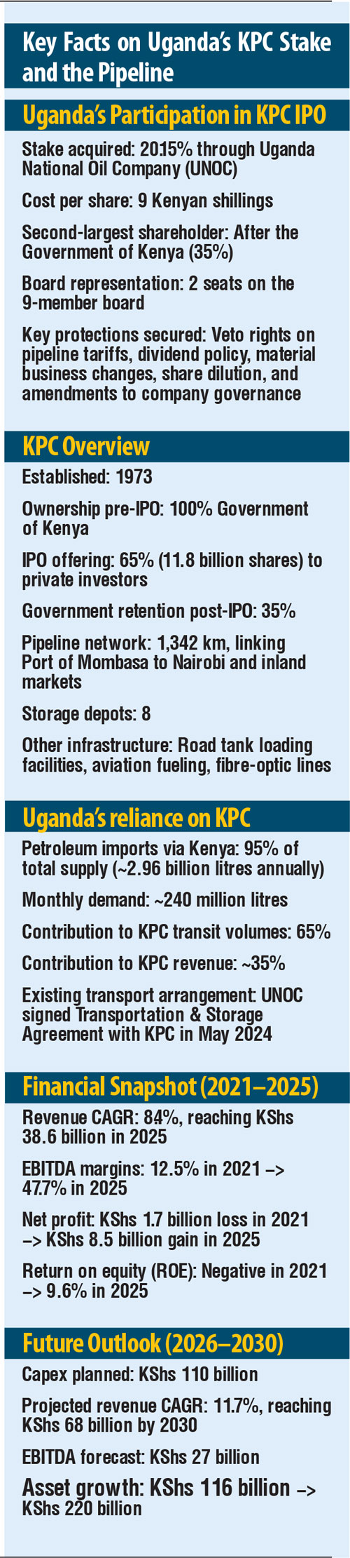 Uganda’s reliance on KPC is structural and longstanding. Almost all of its imported petroleum products flow inland from the Indian Ocean port of Mombasa through KPC’s infrastructure before crossing the border. Roughly 95% of Uganda’s fuel imports — about 2.96 billion litres annually — transit via the Kenyan route, accounting for close to 65% of KPC’s transit volumes and about 35% of its revenues. Yet, despite that reliance, Kampala had no formal influence over tariff adjustments, infrastructure planning, dividend policy, or strategic direction.